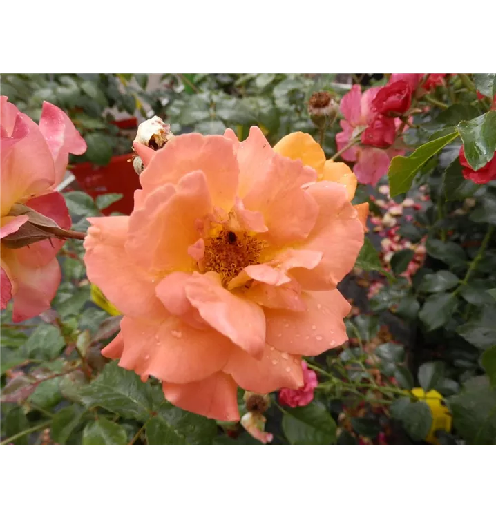 'Westzeit' ist eine robuste und reich blühende Rose, die schon ab Mai und bis in den Oktober immer wieder neue Knospen bildet. Die halbgefüllten Blüten stehen in Dolden und zeigen ein schönes Farbspiel von orange über apricot bis rosa. Das Laub ist dunkelgrün glänzend und sehr gesund.