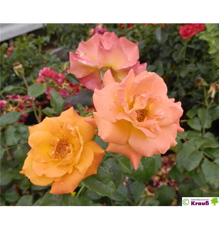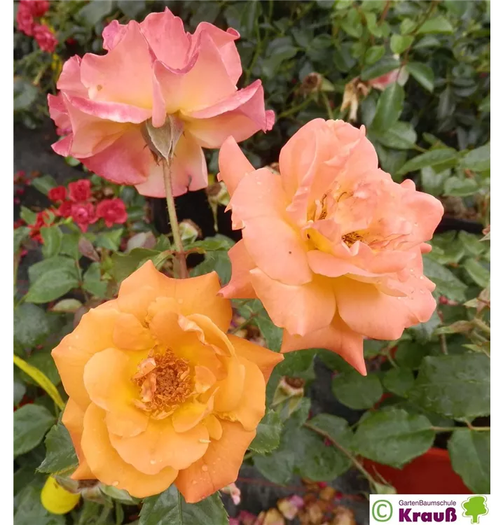 Die halbgefüllten Blüten zeigen ein schönes Farbspiel von orange über apricot bis rosa, das sich je nach Witterung und Alter der Blüten immer wieder verändert. Sie werden etwa 6 cm groß und stehen in Dolden. Schon ab Mai und bis in den Oktober werden immer wieder neue Knospen gebildet.