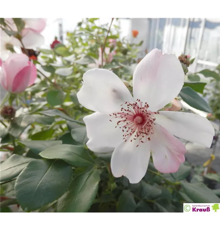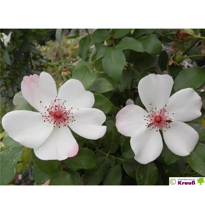 'Sweet Pretty' ist eine robuste, ungefüllt blühende Rose. Die Blütenblätter changieren zwischen reinweiß und einem zarten, frischen Rosa. Aus der pinkfarbenen Blütenmitte ragen markante, goldbraune Staubgefäße wie ein Krönchen in die Höhe. Die Sorte erhielt mehrere Preise, u.a. 2005 die Goldmedaille im Rosenneuheitenwettbewerb sowie die "Goldene Rose der Stadt Baden-Baden“.