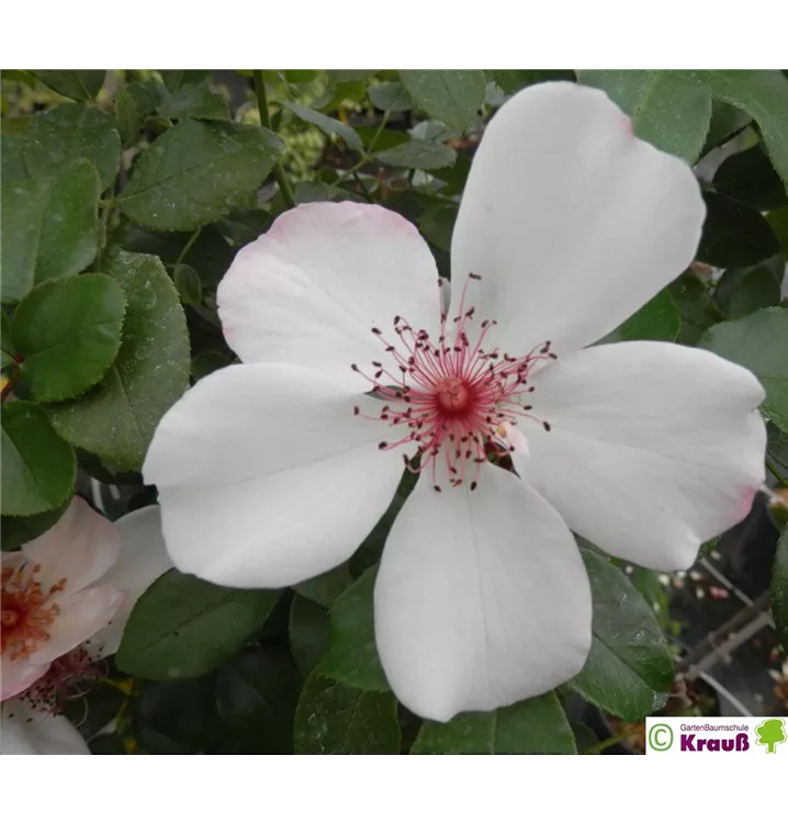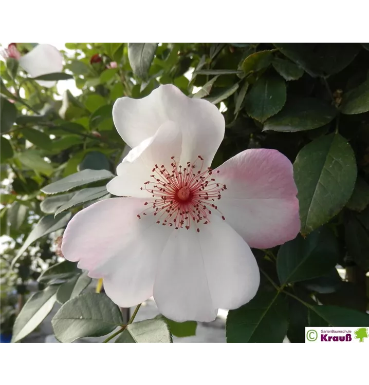 Die Blütenblätter der einfachen, ungefüllten Blüten changieren zwischen reinweiß und einem zarten, frischen Rosa. Aus der pinkfarbenen Blütenmitte ragen markante, goldbraune Staubgefäße wie ein Krönchen in die Höhe. Die Blüten werden etwa 6 - 7 cm groß und stehen in Dolden. Die Sorte blüht reich und über einen langen Zeitraum und bietet auch Insekten Nahrung.