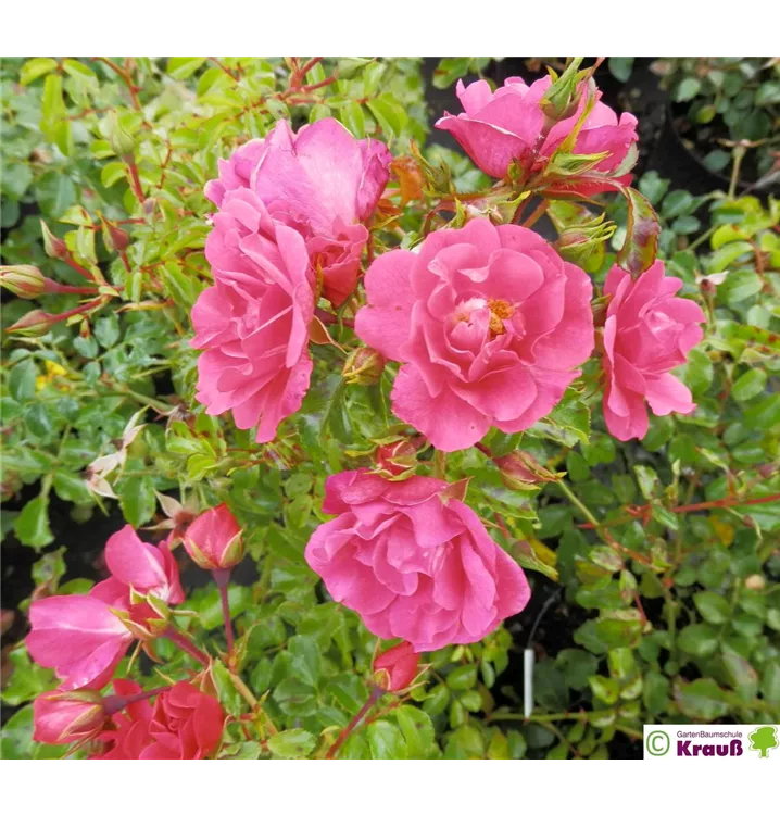 Die gefüllten Blüten sind leuchtend karminrosafarben und stehen in dichten Dolden aus 4-5 cm großen Einzelblüten. Die Sorte blüht lange lange und reich.
