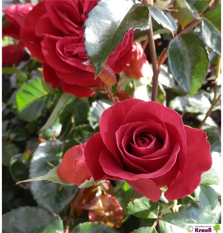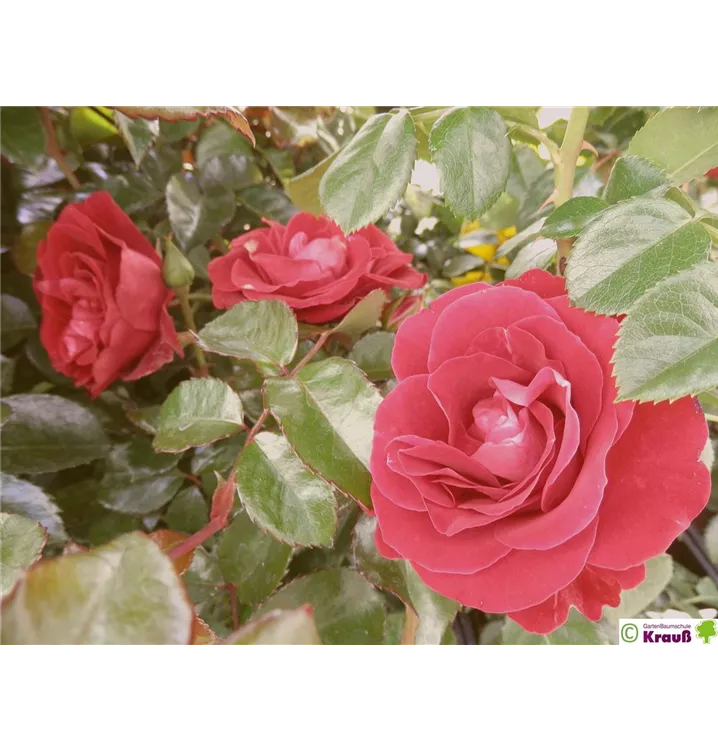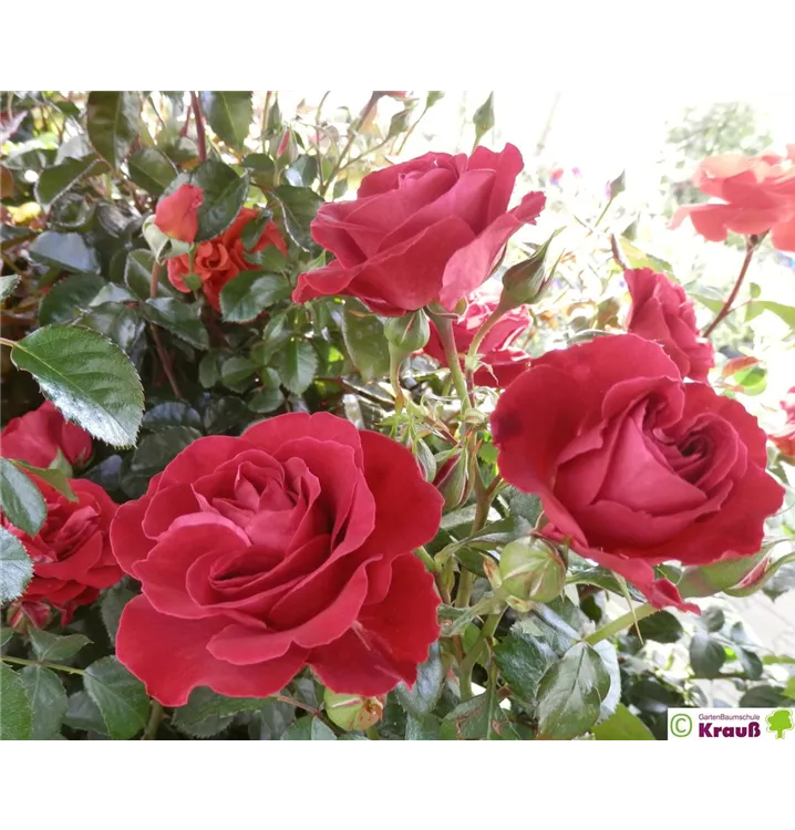 Die klassisch samtroten, gefüllten Blüten sind etwa 8 - 10 cm groß und stehen in Dolden. Sie sind über die gesamte Blütezeit sehr farbstabil. Die Knospen sind edelrosenähnlich, voll erblüht zeigt die Rose in der Mitte gelbe Staubgefäße.