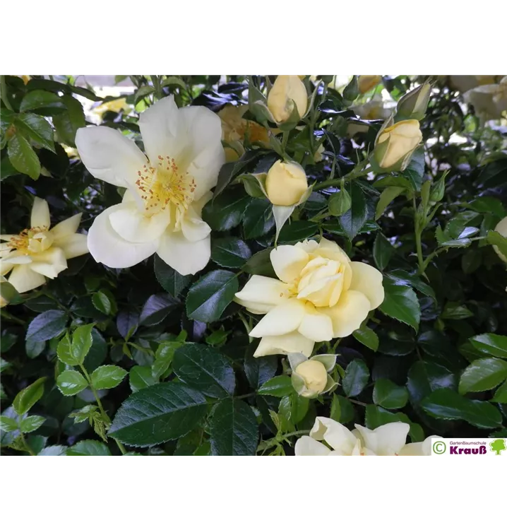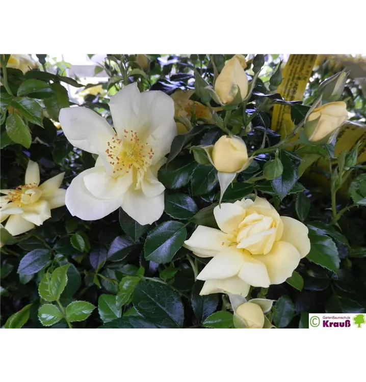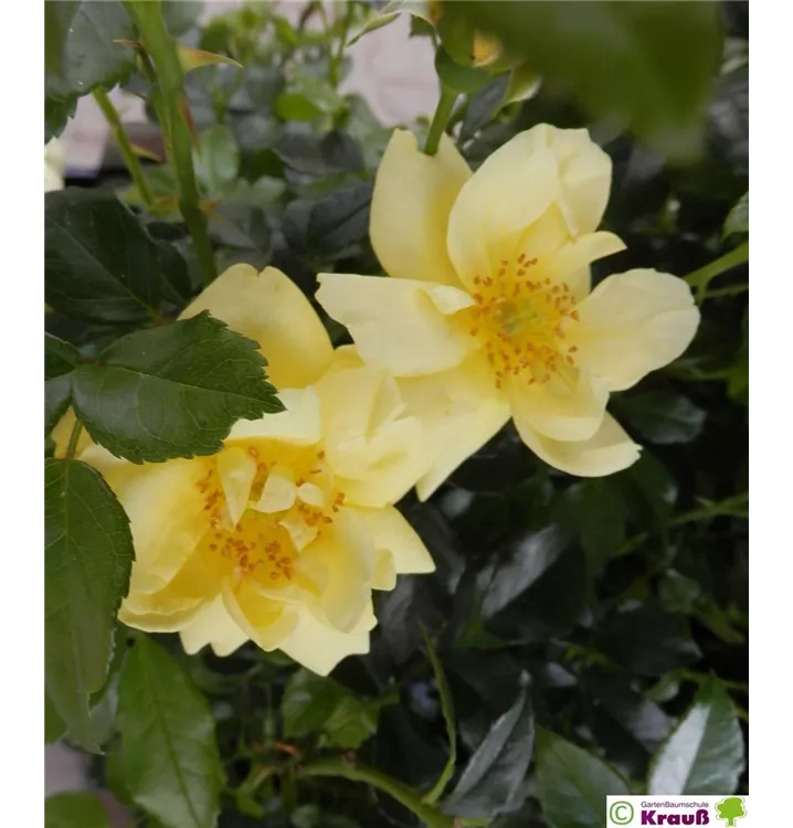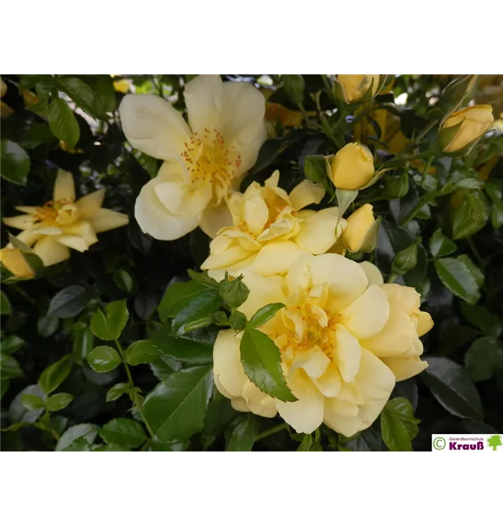 Die leuchtend gelben Blüten sind schalenförmig und halb gefüllt. Während der Blütezeit werden sie nur wenig heller und erzielen vor allem in Gruppen gepflanzt eine gute Fernwirkung. Die Einzelblüten werden etwa 5 cm groß und bilden üppige Dolden.