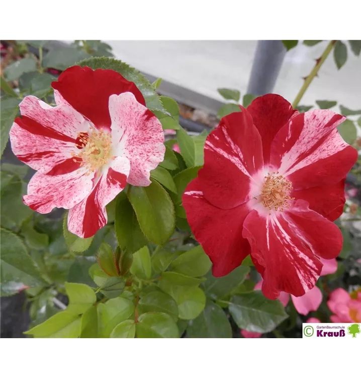 'Candy Land' ist eine fröhlich bunte Kletterrose, die eine Höhe von 3 - 4 m erreichen kann. Die offenen, schalenförmigen Blüten sind kräftig pink mit weißen bis cremegelben Streifen. Dabei fällt jede Blüte anders aus.
