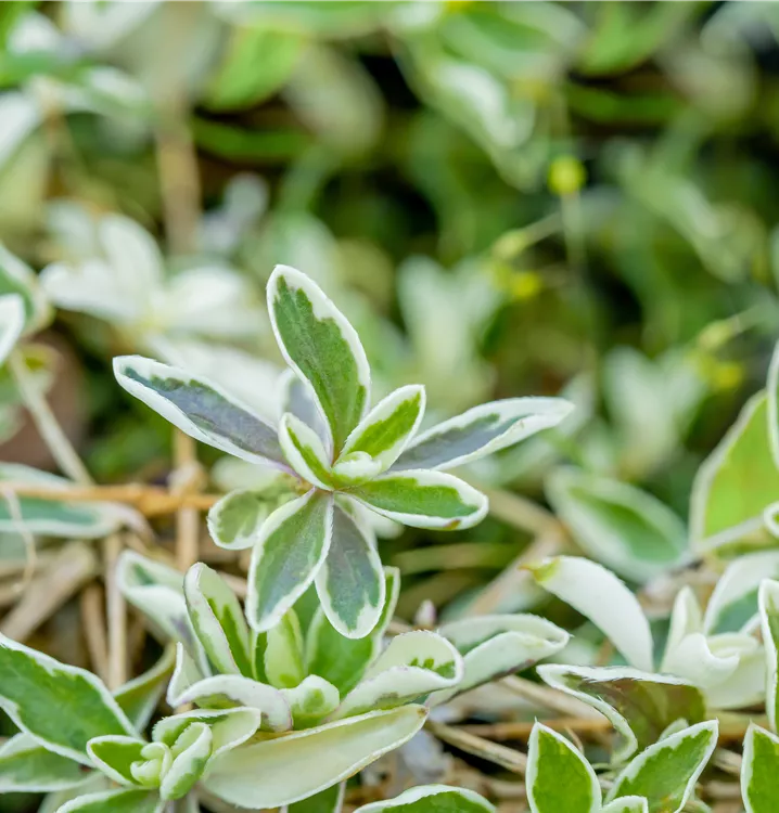 Hoher Blattschmuckwert. Die wintergrünen Blätter der Kleine Garten-Gänsekresse 'Variegata' sind grün, lanzettlich und weisen einen weißen Rand auf.