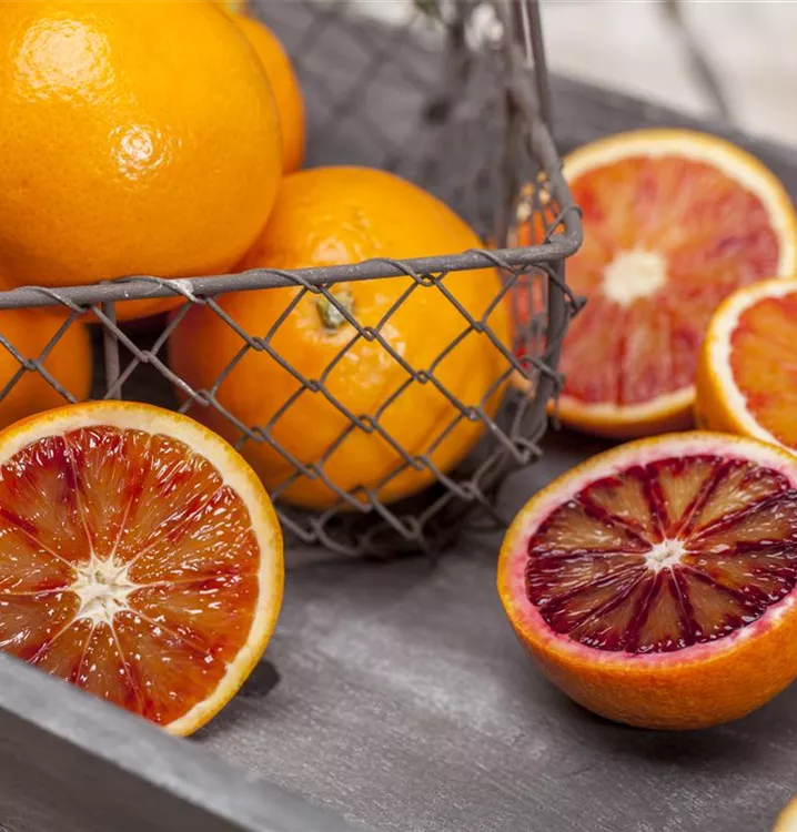 Citrus sinensis bildet orangefarbene Früchte mit einem süß-säuerlichen Geschmack. Reifezeit ab September.