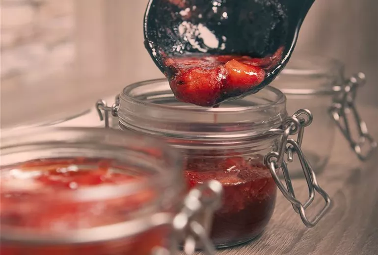Zu den ersten Kandidaten im Jahr für eine Existenz im Marmeladenglas zählen die Erdbeeren. Später folgen weitere rote Beeren wie Johannisbeeren und Himbeeren. Auch andere Früchte der gleichen Farbe sind nicht zu vernachlässigen. Ob Sauer- oder Süßkirsche, diese wunderbare Erscheinung auf den entsprechenden Bäumen will man doch nicht komplett den Staren überlassen! Also heißt es ernten und in Brotaufstrich verwandeln. Ein Schildchen mit Inhalt und Herstellungsdatum auf die Vorderseite des Behälters, und ab in den Vorratskeller. Mit einem kleinen Stoffhäubchen hübsch verziert, eignen sich die Selfmade-Produkte auch bestens als Mitbringsel. Wieder einmal freuen sich vor allem diejenigen, die keinen Garten haben, über so viel naturnahe Nahrung. Denn Gartenerzeugnisse schlagen immer noch Marktangebote. Das funktioniert mit Mirabellen, Äpfeln, Birnen und den anderen Obstsorten genauso gut.